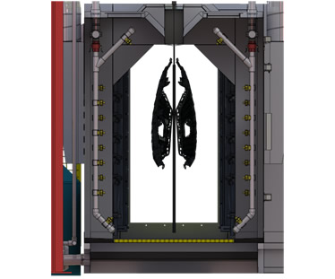 This ash travels to the filtration area, where it is collected for manual removal. Overhead roll-up doors, located at the front and rear of the booth, allow the operator to access the load for manual detailing and final removal.
